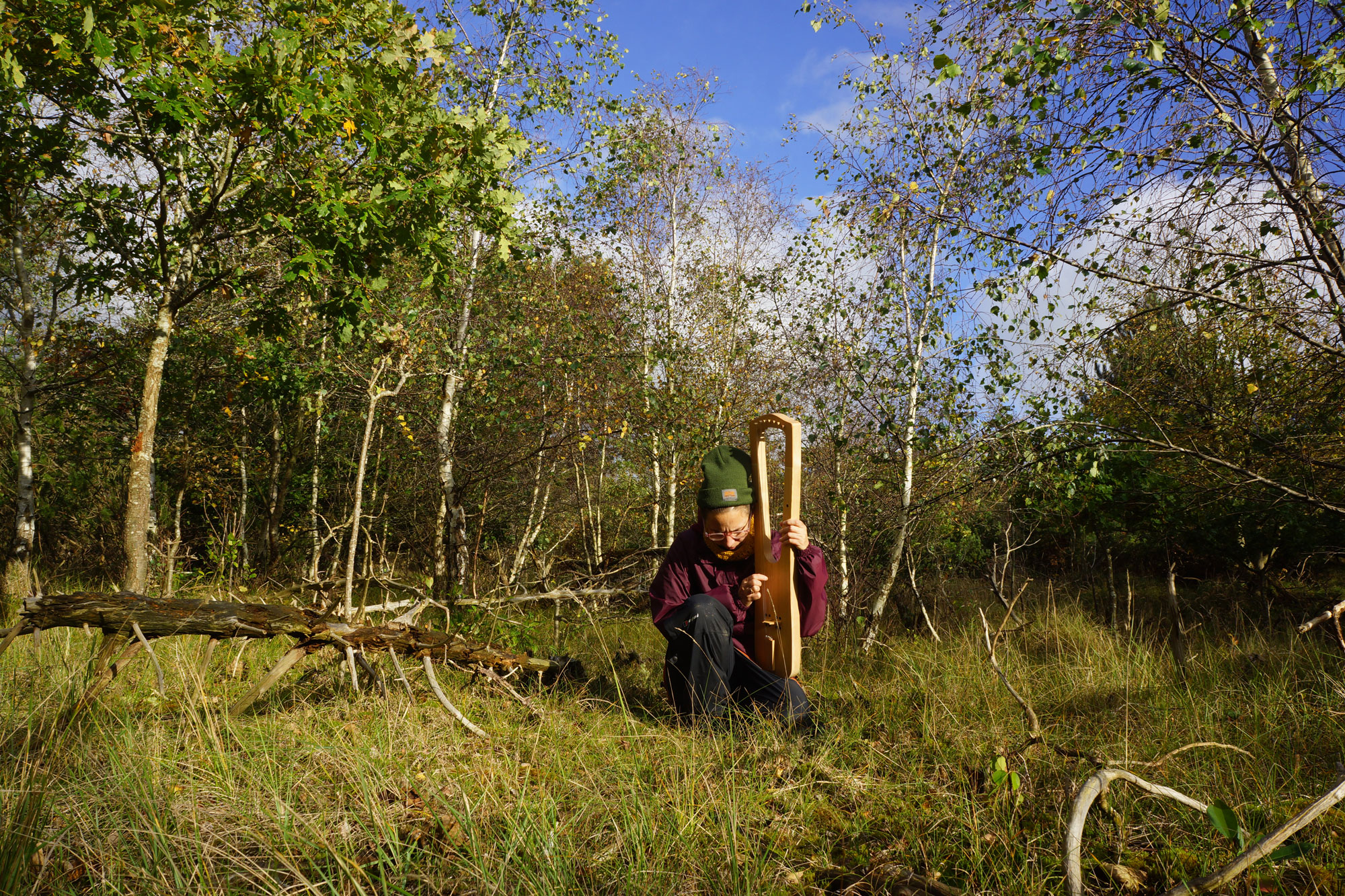 Kate improvises on the lyre in the forest near Burgh Haamstede, Zeeland, October 2023.